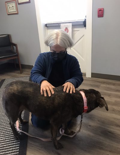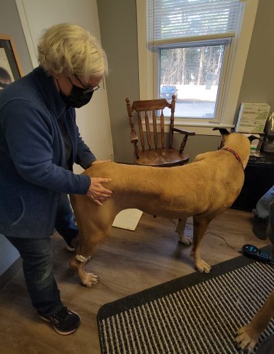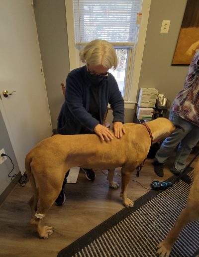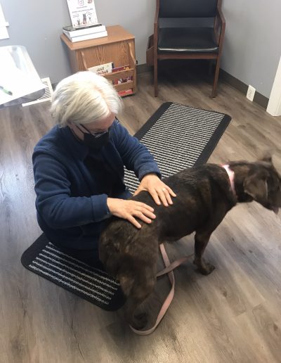 There are periodic breaks between each series of moves as this gives the body time to realign itself before the next series of moves. You may notice your dog yawn, lick its paw, or pass gas. This indicates that the therapy is working.